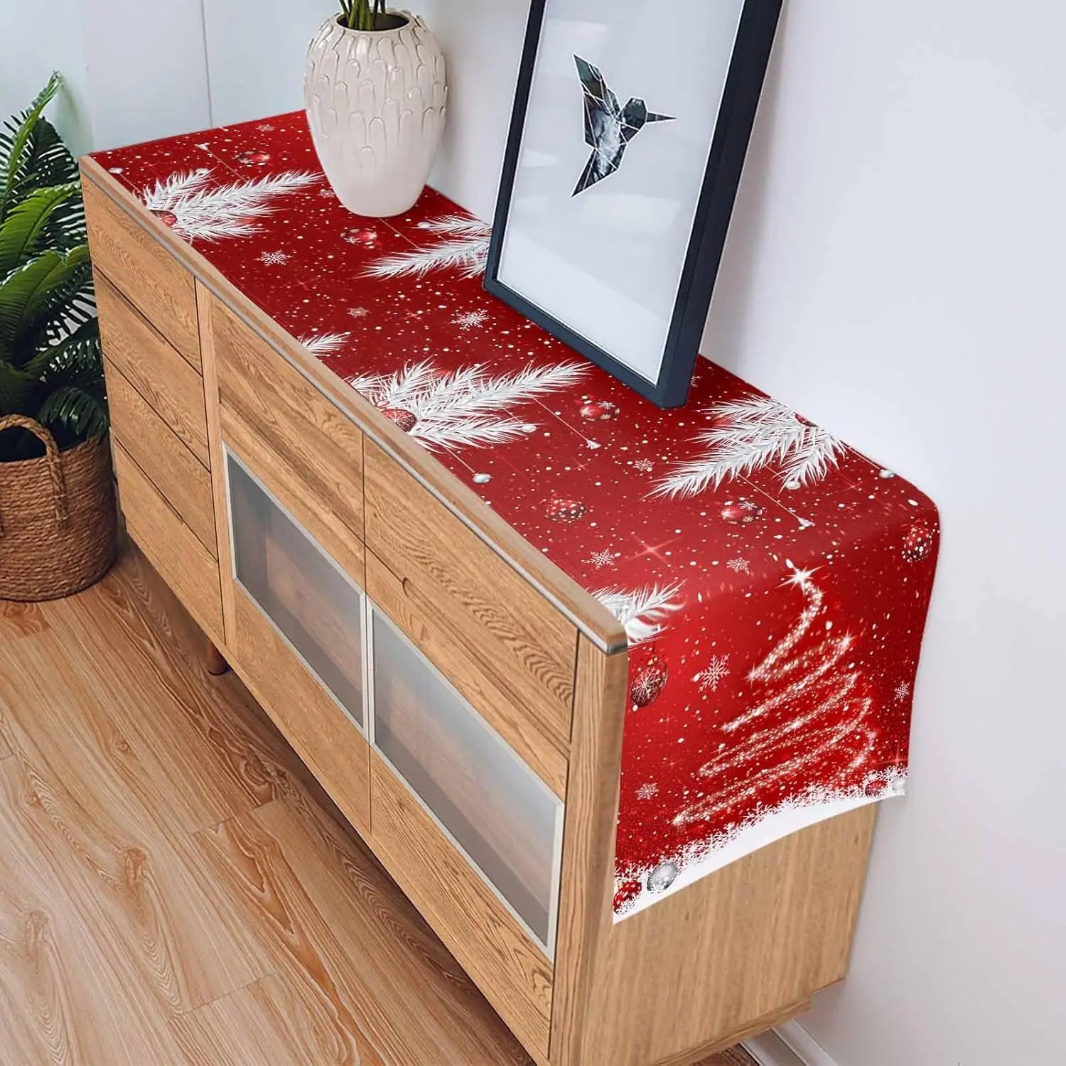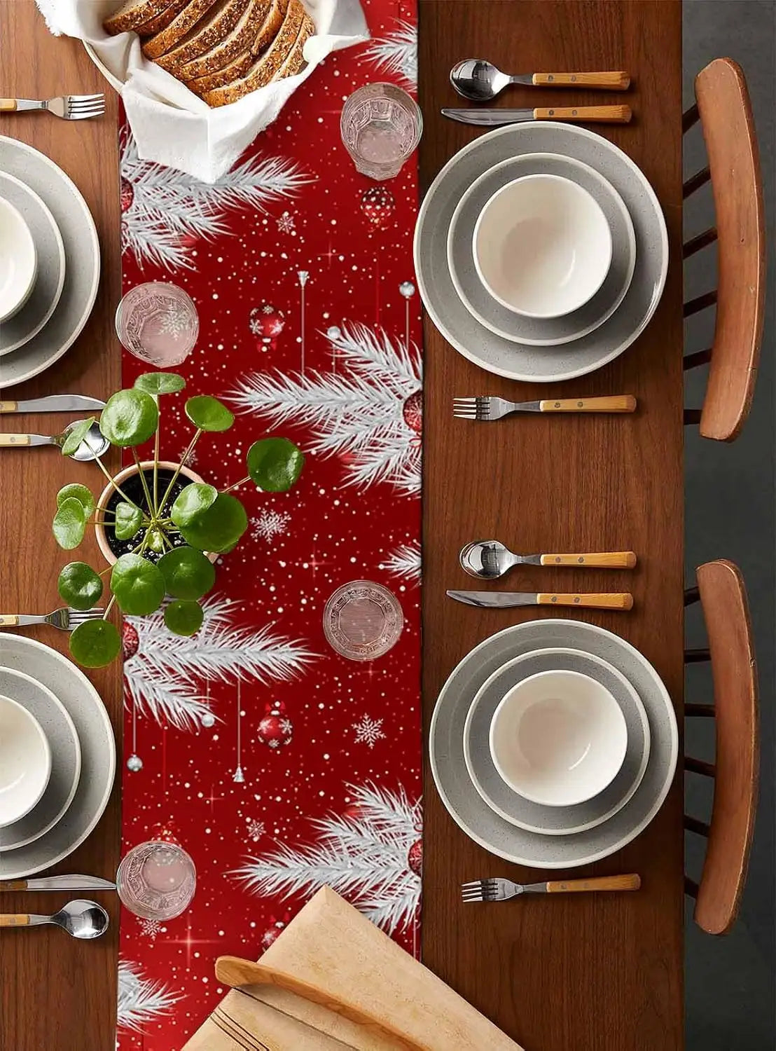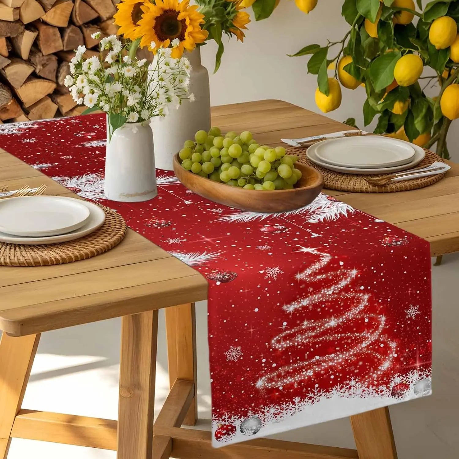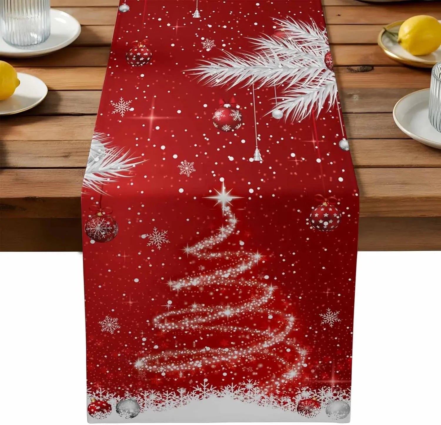 Este camino de mesa de lino presenta un diseño elegante con agujas de pino navideño y copos de nieve que evocan el espíritu invernal. Ideal para decorar el comedor o la cocina durante las festividades.