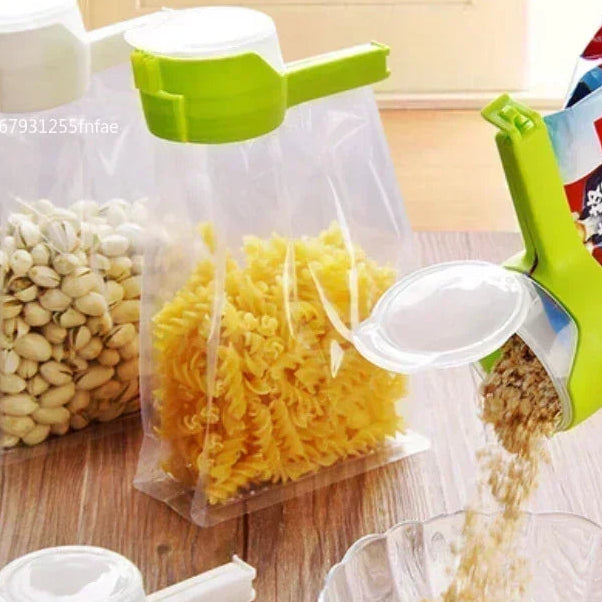 Este práctico utensilio de cocina funciona como clip de cierre para bolsas, con una boquilla dispensadora ideal para conservar snacks y alimentos secos. Su diseño sellador garantiza un cierre hermético que evita derrames. Fácil de usar.