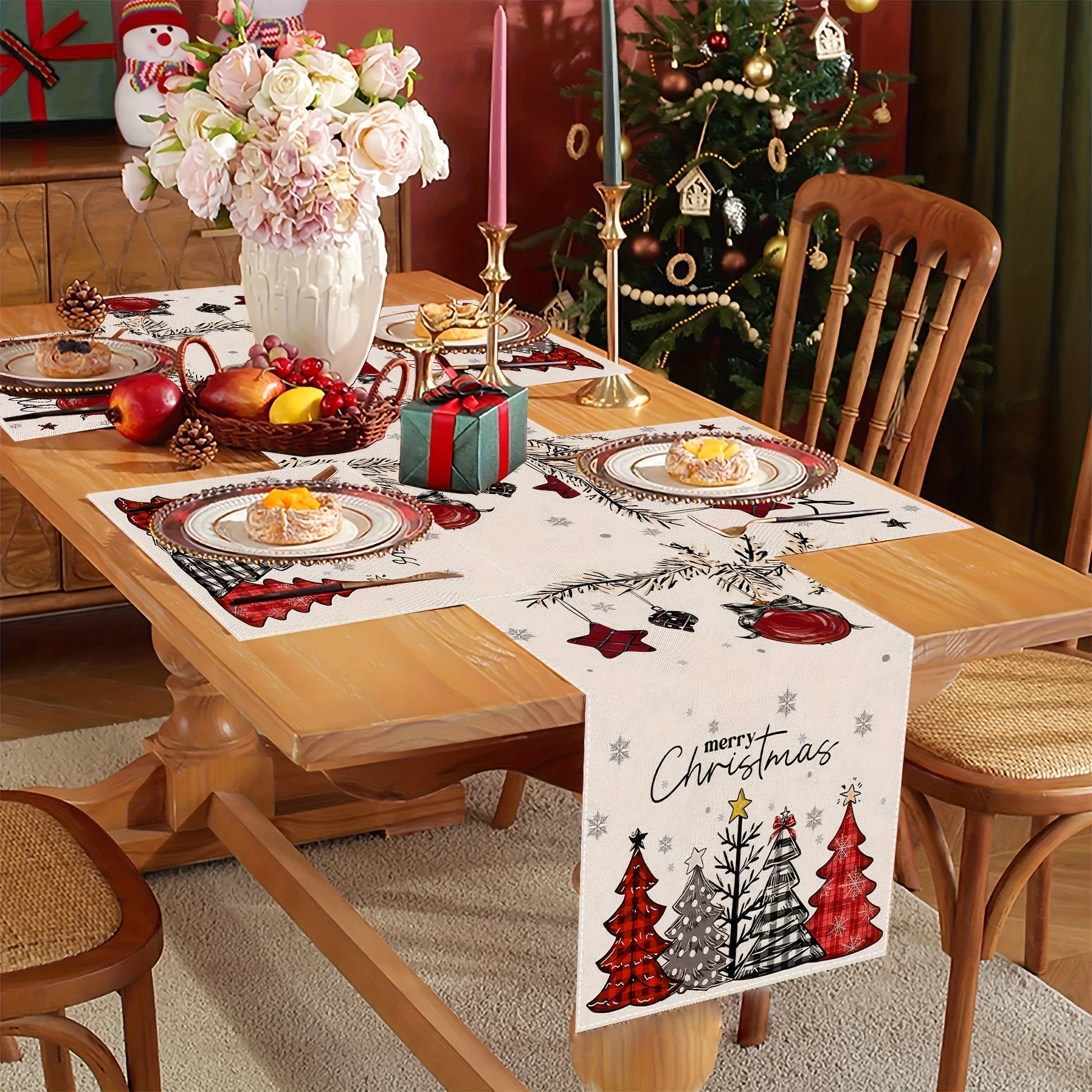 Este camino de mesa en lino tiene motivos de árbol de Navidad y copos de nieve. Ideal para ambientes de invierno, realza su cocina o comedor con un diseño elegante y festivo que complementa perfectamente las celebraciones navideñas.